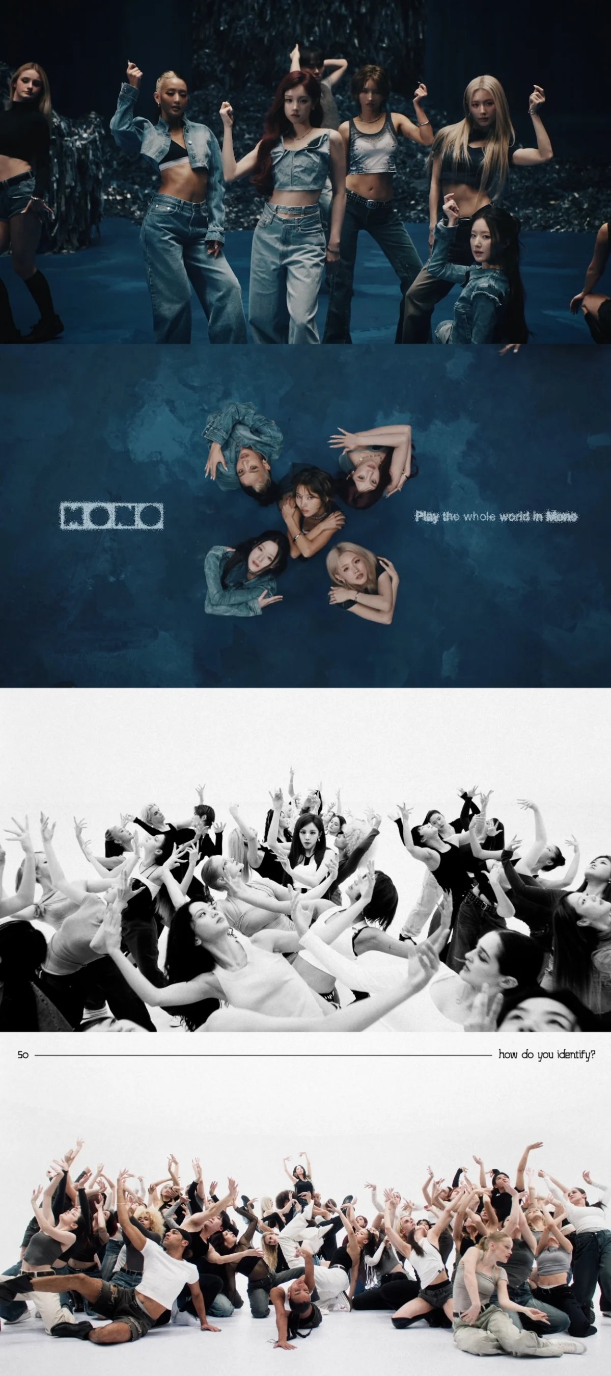 มิวสิกวิดีโออย่างเป็นทางการ ‘Mono (Feat. skaiwater)’ ได้สะกดใจผู้ชมด้วยการใช้เทคนิคพิเศษที่ล้ำสมัย แปลคลื่นเสียงหลากหลายรูปแบบ และใช้ศิลปะลูกตุ้มเพื่อสร้างลวดลายที่ซับซ้อน จุดที่ทรงพลังที่สุดในวิดีโอคือช่วงที่ภาพขาวดำเปลี่ยนเป็นสีสันสดใสระหว่างท่อนของ Miyeon ซึ่งสอดคล้องกับเนื้อเพลง “you know you’re born to love” อย่างสมบูรณ์แบบ การเปลี่ยนผ่านที่ทรงพลังนี้ได้เสริมส่งข้อความอันซาบซึ้งของเพลงให้เด่นชัดขึ้น โดยแสดงออกถึงการแสดงสีหน้าอันลึกซึ้งและอารมณ์ที่สมาชิกถ่ายทอดออกมา