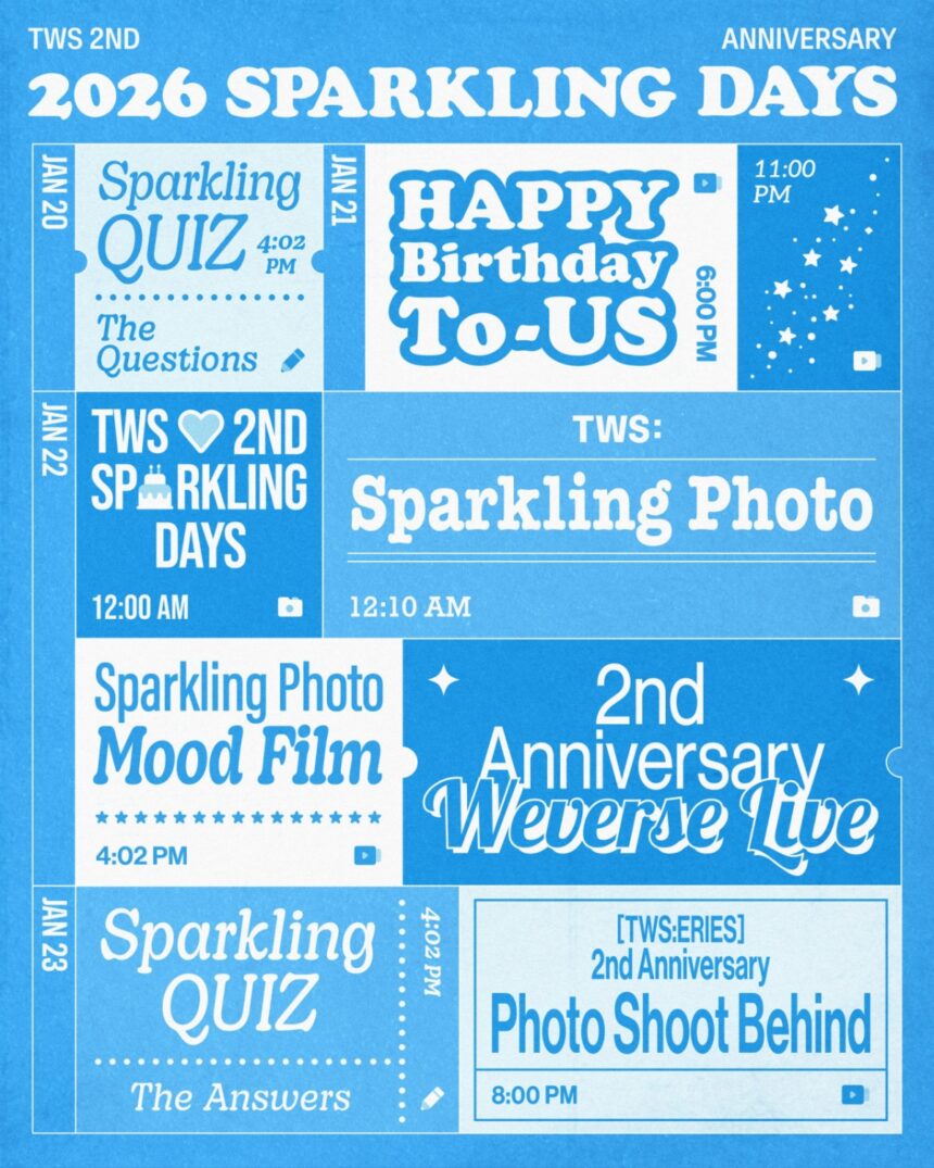 ในวันที่ 20 มกราคม 2026 เวลา เที่ยงคืน KST ทาง TWS (ที่ประกอบไปด้วย Shin-yu, Do-hoon, Young-jae, Han-jin, Ji-hoon และ Kyeong-min) ได้ปล่อยตารางกิจกรรมทั้งหมดของงาน ‘2026 Sparkling Days‘ ผ่านช่องทาง SNS อย่างเป็นทางการ และแพลตฟอร์มซุปเปอร์แฟน Weverse ซึ่งงานฉลองประจำปีสุดพิเศษนี้ จัดขึ้นเพื่อรำลึกถึง การเดบิวต์ในวันที่ 22 มกราคม ของพวกเขา รับรองว่าจะมีคอนเทนต์มากมายที่แสดงให้เห็นถึงด้านที่ผ่อนคลายและไดนามิกของสมาชิกมากขึ้น เมื่อพวกเขาก้าวเข้าสู่ปีที่สาม บอกเลยว่าห้ามพลาดนะทุกคน!